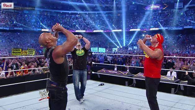Hulk Hogan comes out to a reaction worthy of his Hulkness. As I watched him walk down the ramp I acknowledged that it was awesome seeing him on Raw the last few weeks…but seeing the man at WrestleMania, the event he helped build will always be something special. Hogan hit the mic with his usual shtick, reminiscing about WrestleMania’s past, and lovingly mistaking the venue that they were currently in. The crowd took it in stride and Hulk was able to make fun of himself. Shortly after, a familiar sound…GLASS SHATTERS. Stone Cold makes his return, salutes the crowd, and in a cool moment stares down Hogan like he was about to open up a can of whoop ass. Steve does some reminiscing of his own and give Hulk his props on everything he’s down for the business. Shortly after, IF YA SMELLL…The Rock makes his way down to the ring.
